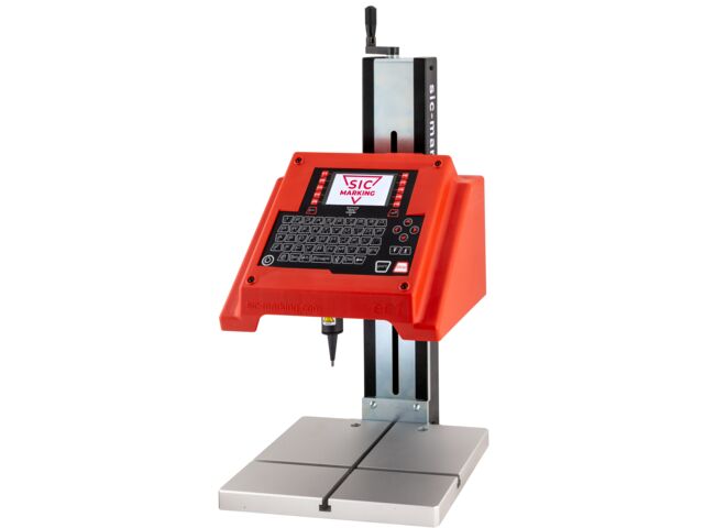 Das äußerst kompakte Handsigniergerät e-mark liegt perfekt in der Hand und hat trotz seines robusten Gehäuses aus Aluguss ein besonders niedriges Gewicht von nur 3,2 kg. Sein Markierfenster beträgt 60x25 mm*. Die Positionierung der Nadel im Verhältnis zur zu beschriftenden Oberfläche ist über eine Flügelschraube einstellbar.