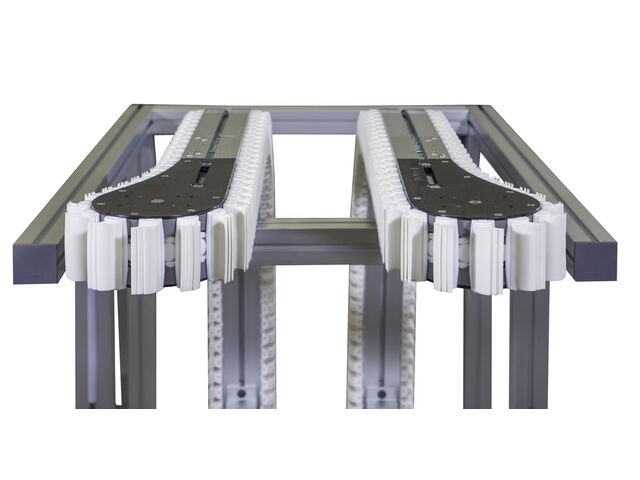 FlexMove Klemmförderer sind mit zwei parallelen FlexMove-Förderern ausgestattet, die eine mit Spezialgummis versehene Kette verwenden. Es wurde entwickelt, um Produkte sicher zwischen den verschiedenen Produktionsebenen zu bewegen. Die Produkte werden zwischen gegenüberliegenden vertikal oder horizontal ausgerichteten Förderbändern geklemmt.