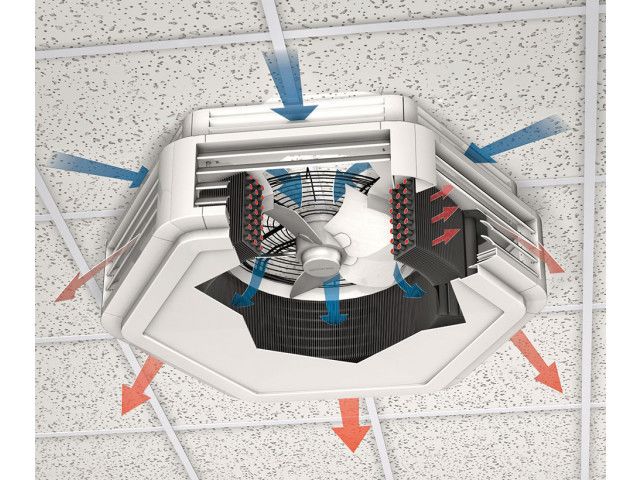 Luft wird über den Axial-Ventilator angesaugt und über den ringförmigen Wärmetauscher in den Raum geblasen. Die erwärmte oder gekühlte Luft wird über die (vor)einstellbaren Lamellen dem Raum bedarfsgerecht zugeführt. Die Ausführungen mit großer Wärmetauscherleistung sind optimal im Niedertemperaturbetrieb einsetzbar.