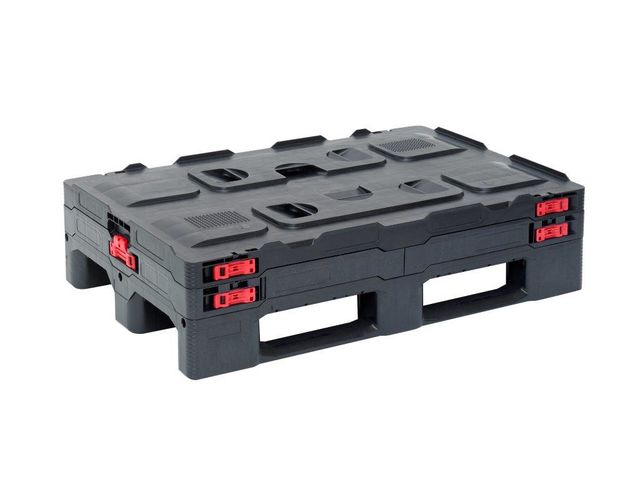 Diese faltbare Mehrwegverpackung ist eine logistische Lösung, bestehend aus einer Kunststoffpalette, einem Ring und einem Deckel. Die Abmessungen sind 1200 mm x 800 mm x 893 mm und das Gesamtgewicht beträgt 33,55 kg. Dank der M-Faltschutzhülse und der Handgriffe am Deckel lässt sich das Smart Sleeve Pack sehr leicht falten und entfalten. Es hat insgesamt 10 Schlösser, um den Ring in der Palette und im Deckel zu verriegeln. Das Smart Sleeve Pack ist auch in ESD-Material erhältlich.